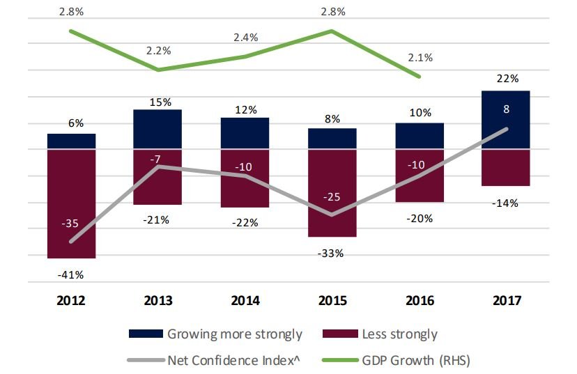 ​ ^ Proportion of respondents expecting the economy to grow minus those expecting the economy to slow.​ Based on over 1100 interviews with senior business executives annually. ​